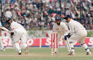 Aminul Islam watches the ball go past the keeper as he plays a leg glance